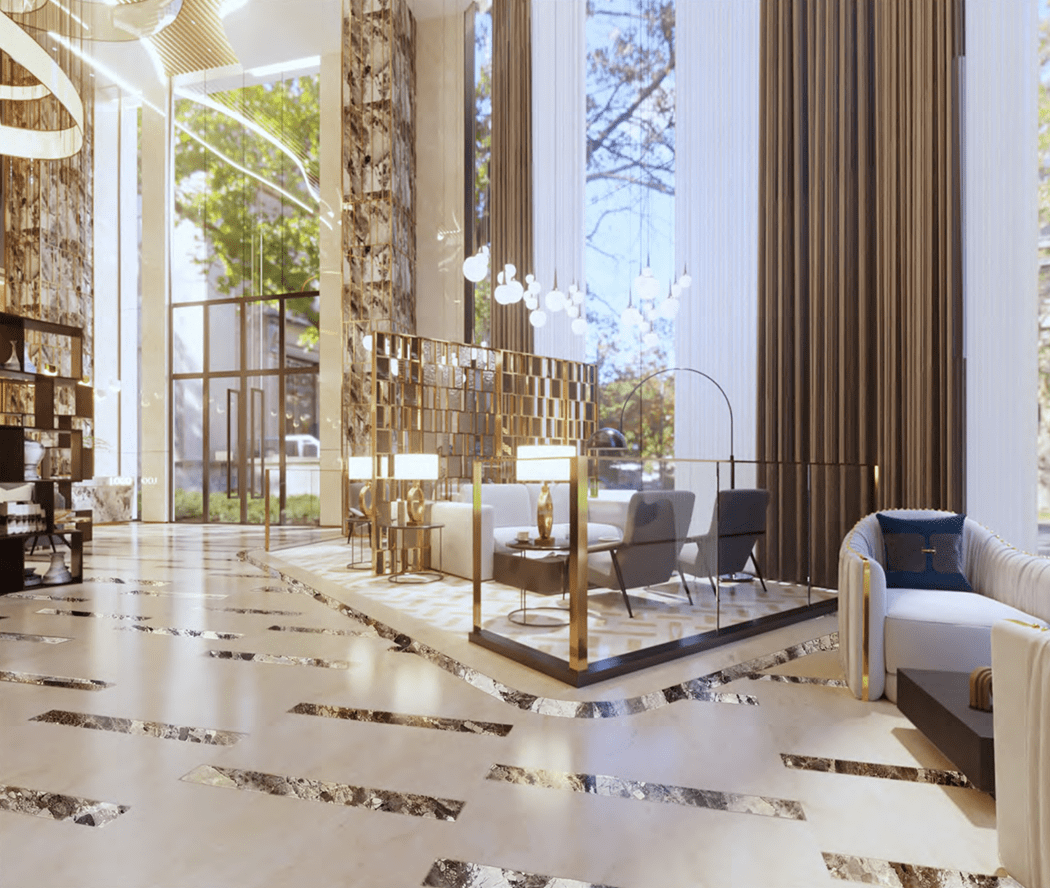 The INMAA O2 Hotel Tower in Saudi Arabia, designed by Grandeur Design and Materials using their “One-stop design project plan,” showcases a high-end aesthetic with luxurious marble, warm neutral palettes, and modern linear lighting across public, office, amenity, and guest floors. The Ground Floor features a grand Reception Lobby with high ceilings, yellow-veined marble columns, intricate marble-inlay flooring, lounge areas, and direct outdoor access. The Mezzanine accommodates offices, management spaces, corridors, waiting areas, and service rooms with sleek minimalist finishes. The First Floor is dedicated to dining and café services, with formal table layouts, modern chandeliers, marble counters, and outdoor balcony seating. Typical guest floors, such as the fifth floor, offer luxurious suites with rich dark wood tones, textured feature walls, plush furnishings, marble-finished bathrooms with soaker tubs, dual vanities, and balconies with modern decking and green walls. The Roof Floor provides informal dining and social spaces, featuring indoor seating with wood flooring and an expansive outdoor deck for al fresco dining, combining comfort, elegance, and functional luxury throughout the tower.